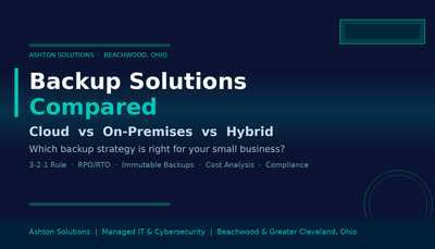 Compare cloud, on-premises, and hybrid backup strategies for small businesses. Covers the 3-2-1 rule, RPO/RTO, immutable backups, cost analysis, and compliance requirements. Expert guidance from Ashton Solutions in Beachwood, Ohio.