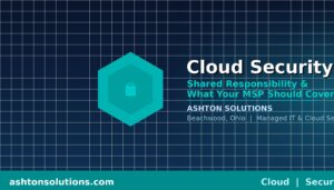 Learn how the cloud shared responsibility model works, what your MSP should provide for cloud security, and how Ashton Solutions protects businesses across Cleveland and Beachwood, Ohio. Includes coverage of shared responsibility, misconfigurations, DLP, identity management, compliance, and MSP expectations.