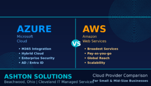 Azure vs AWS for Small Businesses: A Cleveland IT Provider’s Take Ashton Solutions, a Beachwood, Ohio IT provider, compares Microsoft Azure vs AWS for small businesses: pricing, M365 integration, hybrid cloud, security certifications, and when to choose each platform. Read More »